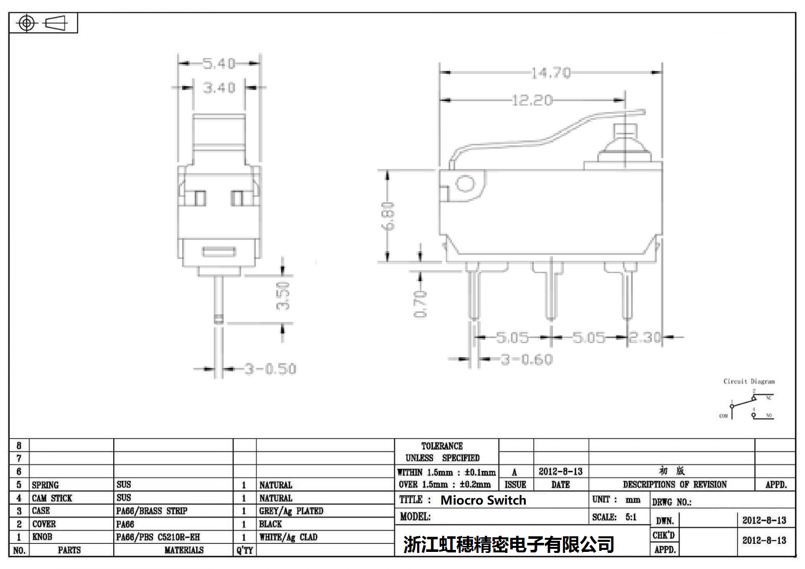 .请根据额定值电流、操作负载、驱动杆的种类、使用温度等要求选择合适型号的开关;