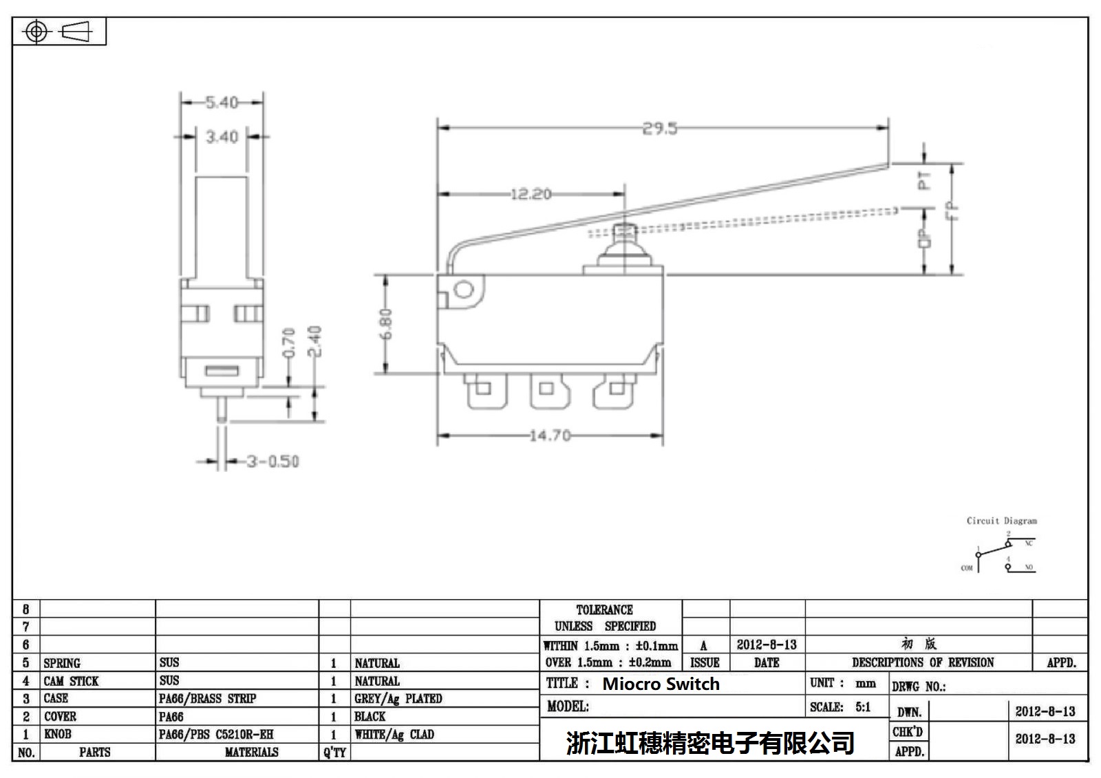 .请根据额定值电流、操作负载、驱动杆的种类、使用温度等要求选择合适型号的开关;