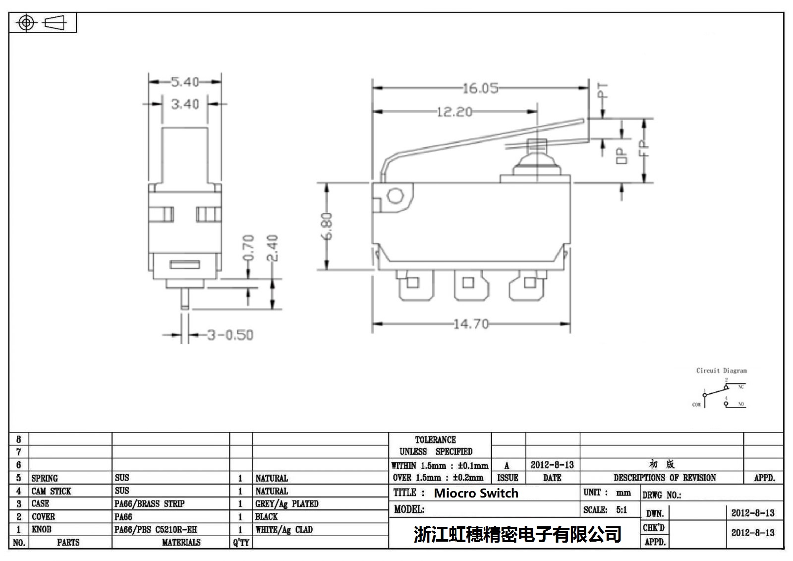 .请根据额定值电流、操作负载、驱动杆的种类、使用温度等要求选择合适型号的开关;