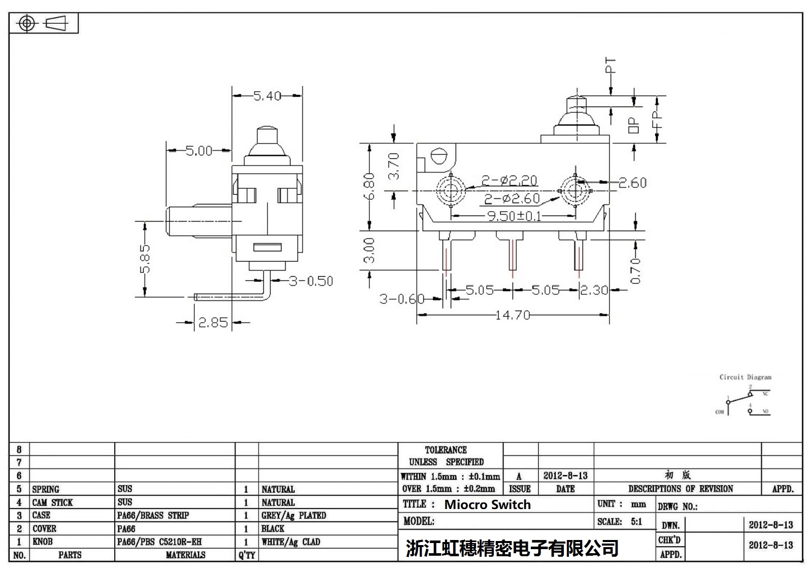 .请根据额定值电流、操作负载、驱动杆的种类、使用温度等要求选择合适型号的开关;