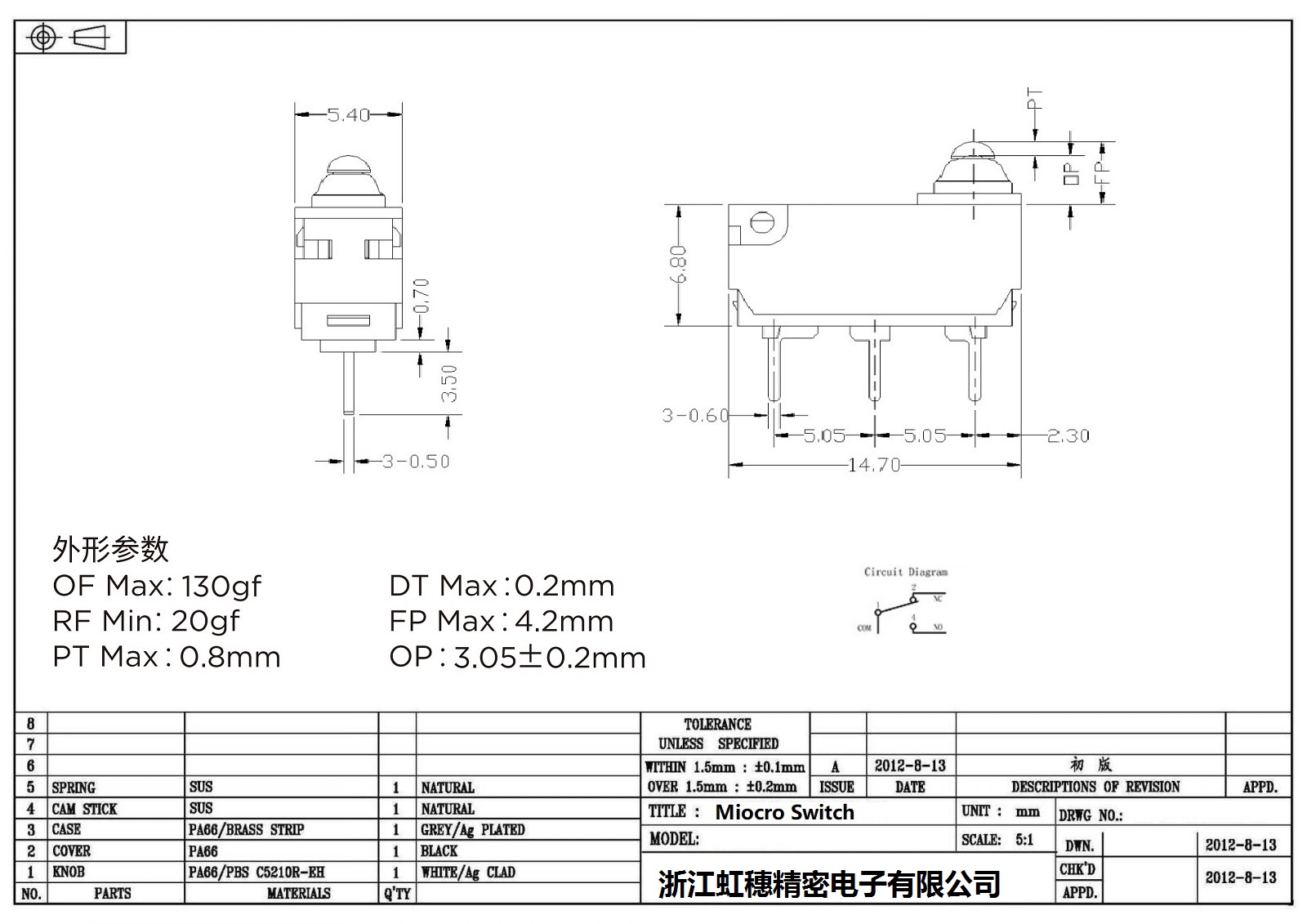 一.请根据额定值电流、操作负载、驱动杆的种类、使用温度等要求选择合适型号的开关;