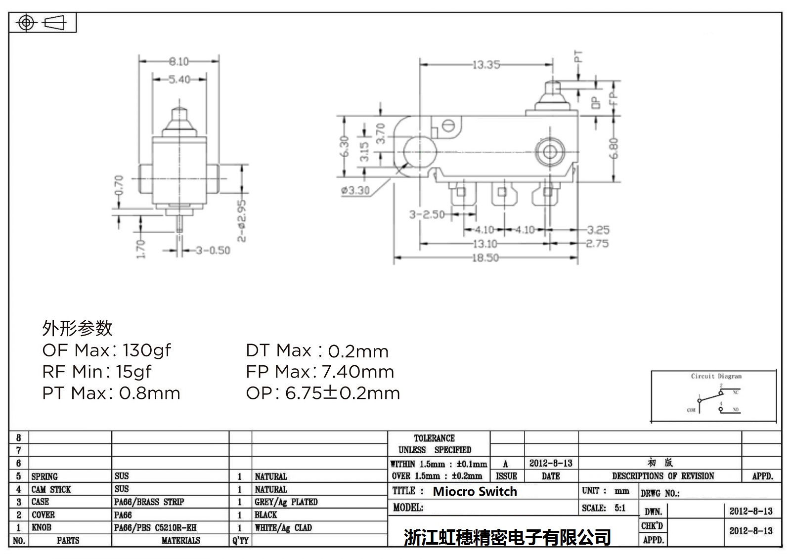 .请根据额定值电流、操作负载、驱动杆的种类、使用温度等要求选择合适型号的开关;