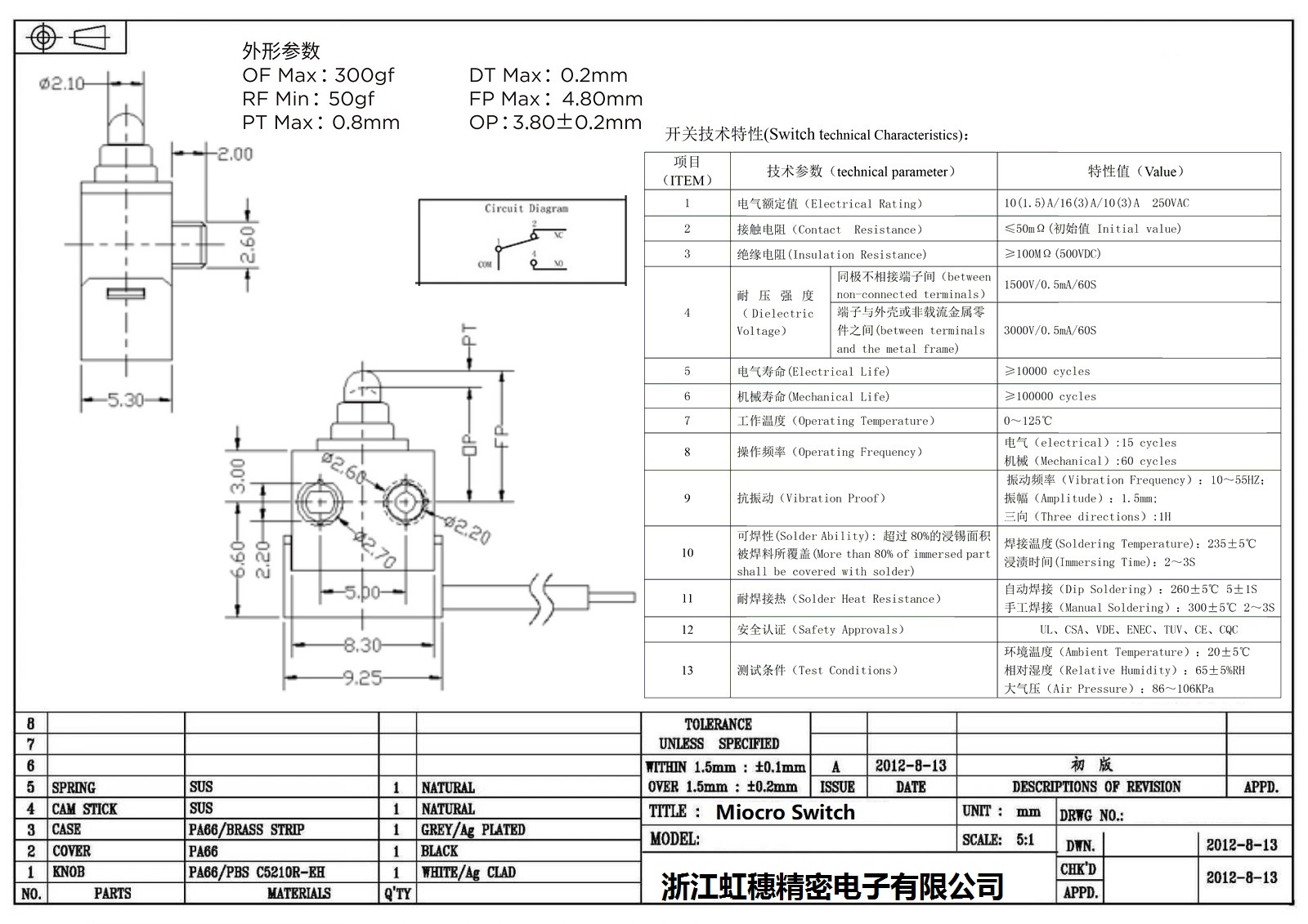 .请根据额定值电流、操作负载、驱动杆的种类、使用温度等要求选择合适型号的开关;