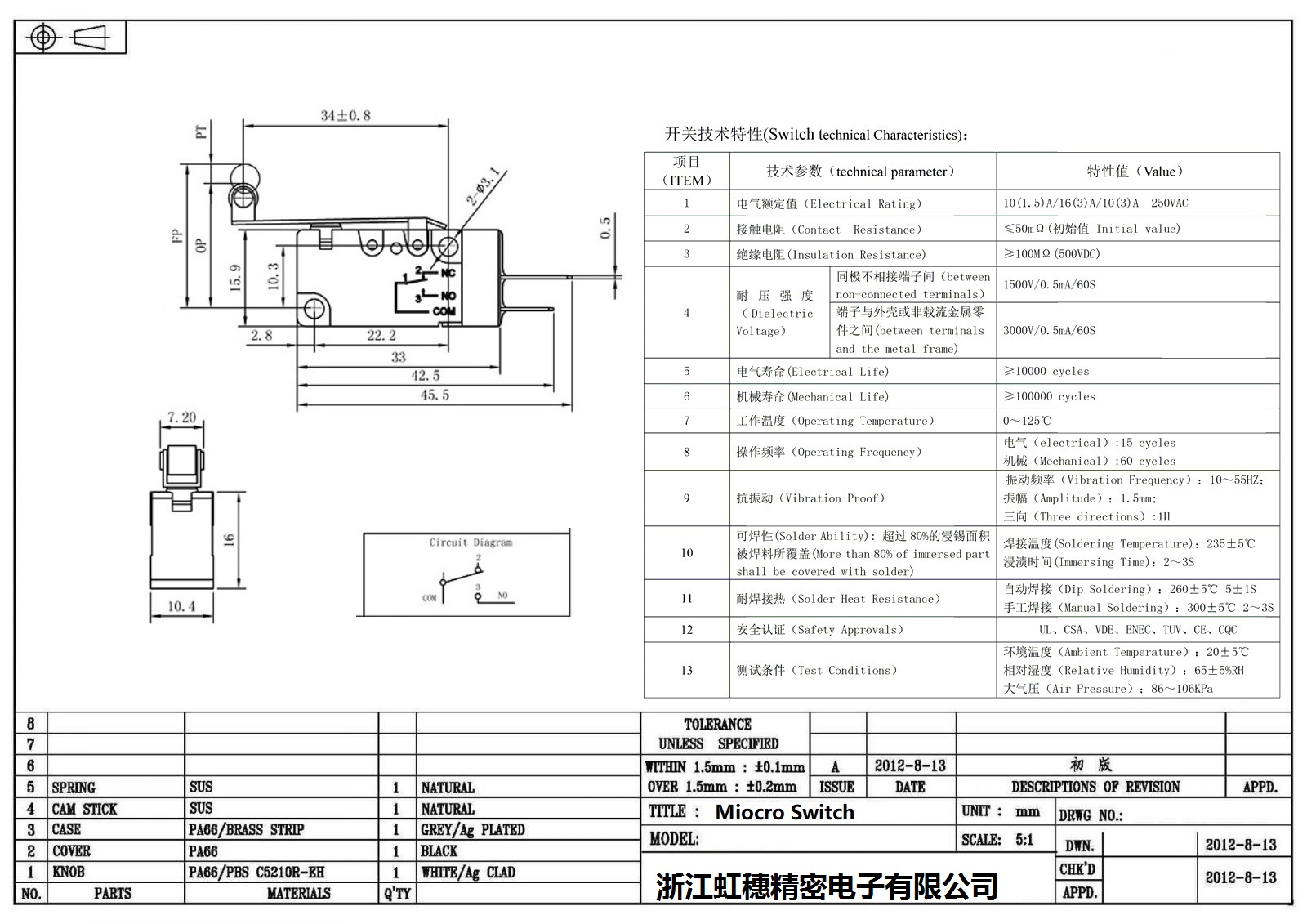 .请根据额定值电流、操作负载、驱动杆的种类、使用温度等要求选择合适型号的开关;