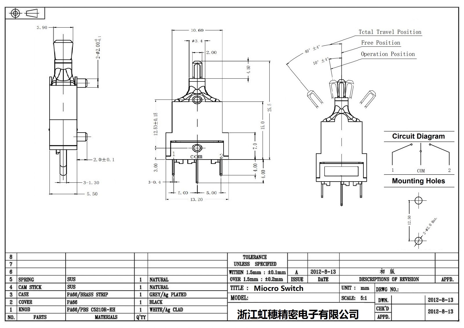 .请根据额定值电流、操作负载、驱动杆的种类、使用温度等要求选择合适型号的开关;