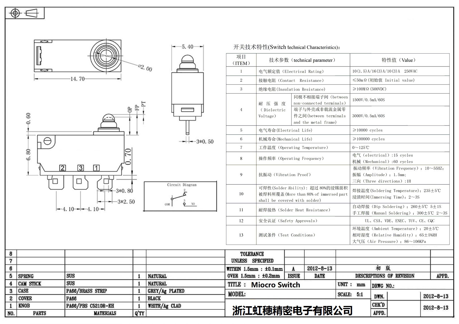 一.请根据额定值电流、操作负载、驱动杆的种类、使用温度等要求选择合适型号的开关;