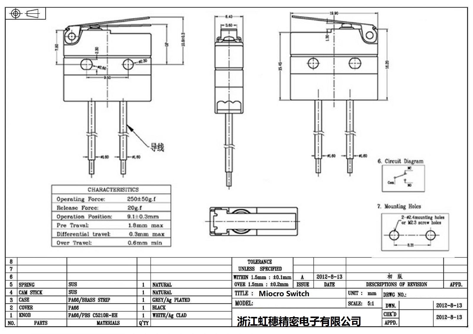 2.额定值:UL:5A125/250VAC 20T105 u 5E4