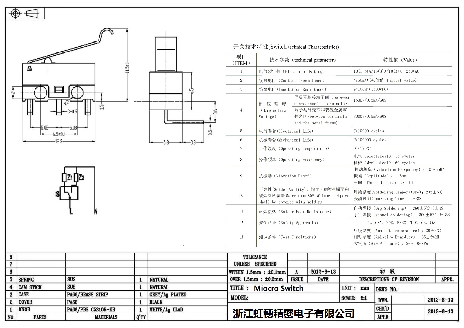.请根据额定值电流、操作负载、驱动杆的种类、使用温度等要求选择合适型号的开关;