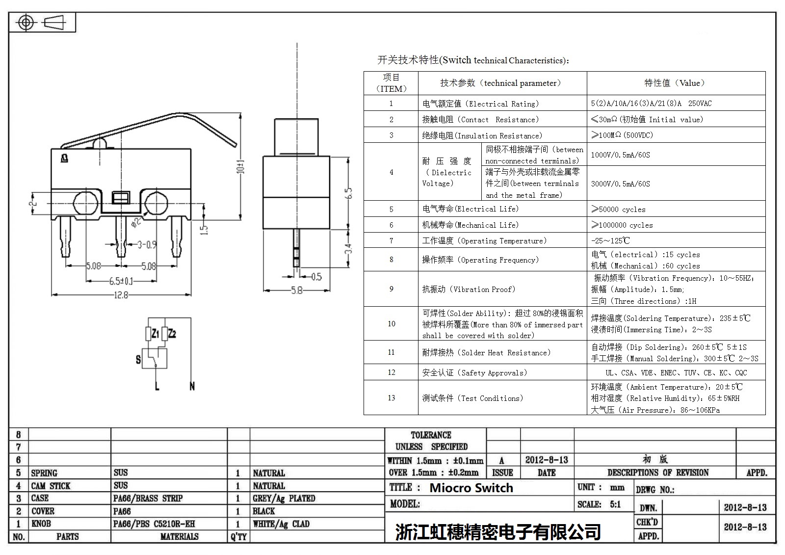 .请根据额定值电流、操作负载、驱动杆的种类、使用温度等要求选择合适型号的开关;
