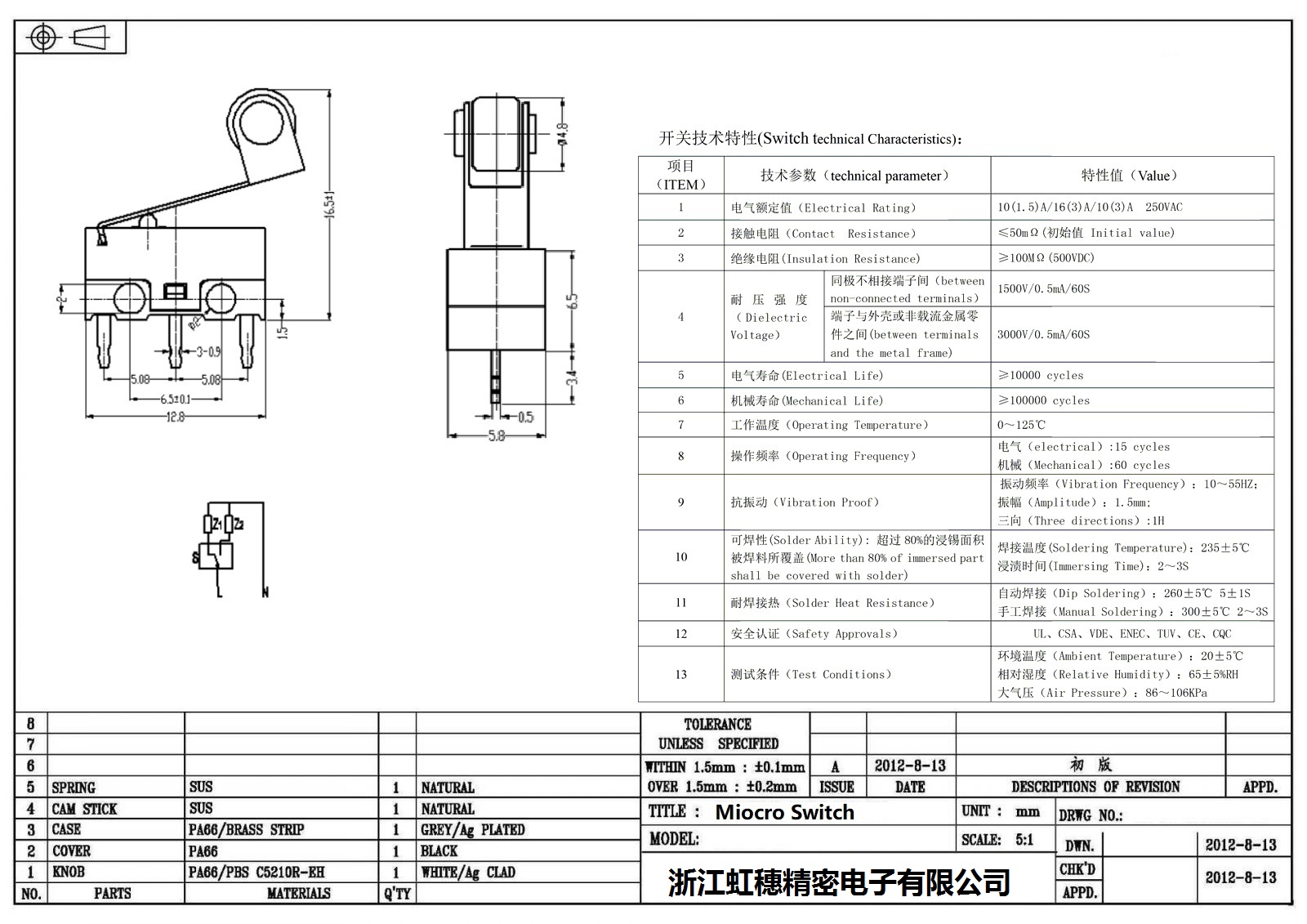 .请根据额定值电流、操作负载、驱动杆的种类、使用温度等要求选择合适型号的开关;