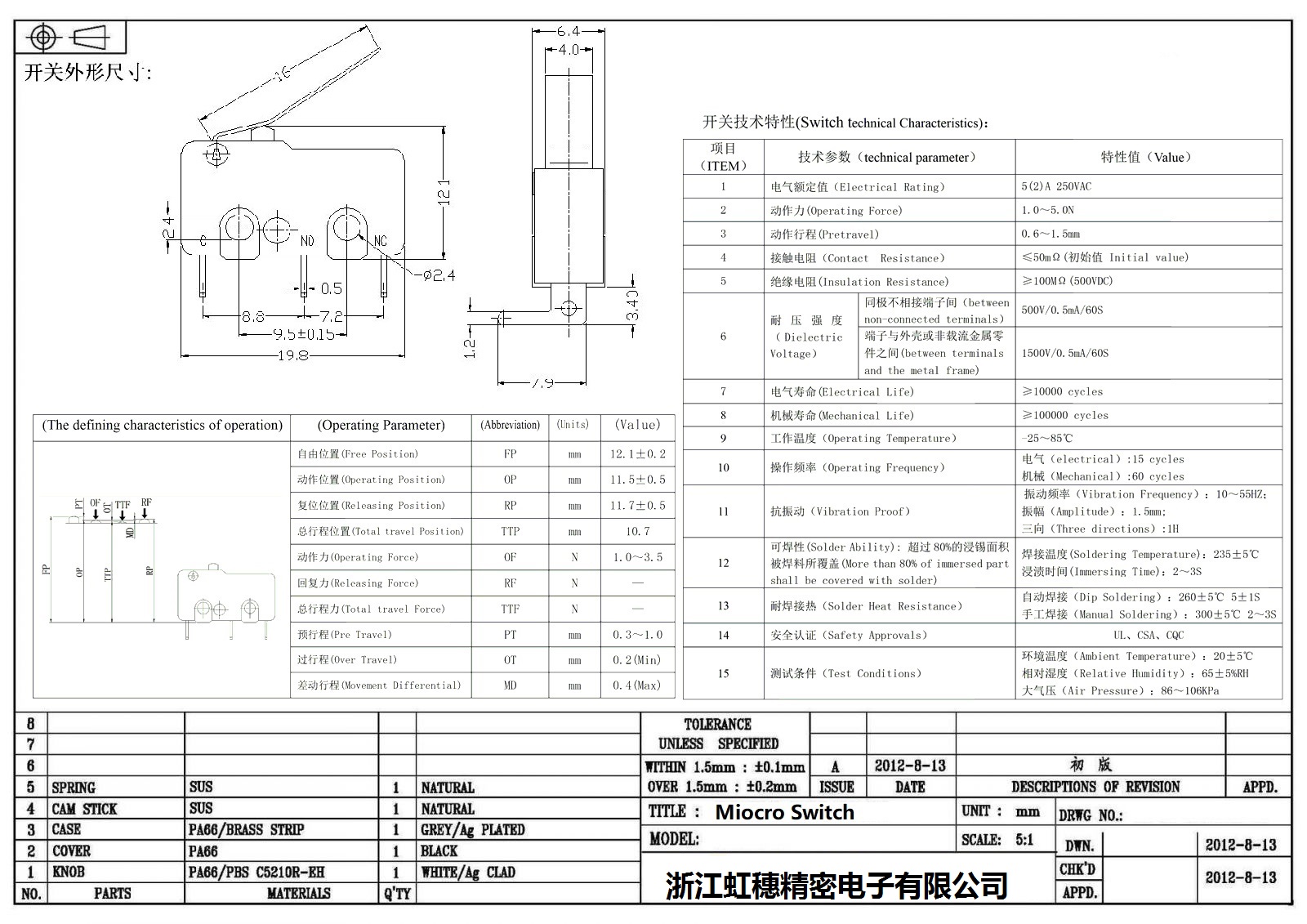 .请根据额定值电流、操作负载、驱动杆的种类、使用温度等要求选择合适型号的开关;