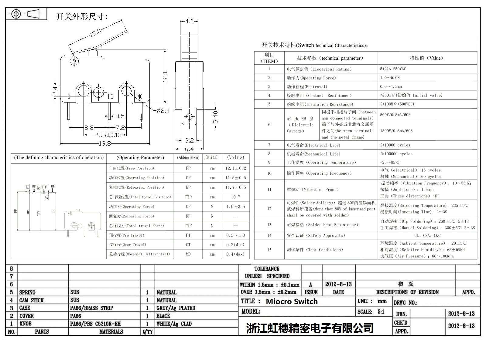 .请根据额定值电流、操作负载、驱动杆的种类、使用温度等要求选择合适型号的开关;