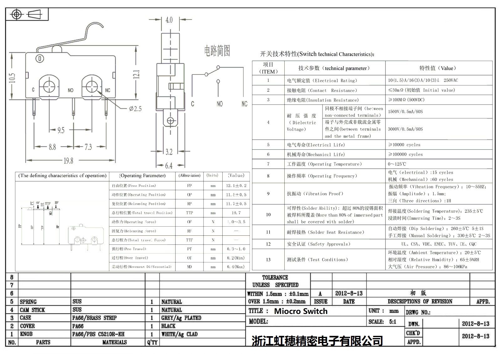 .请根据额定值电流、操作负载、驱动杆的种类、使用温度等要求选择合适型号的开关;