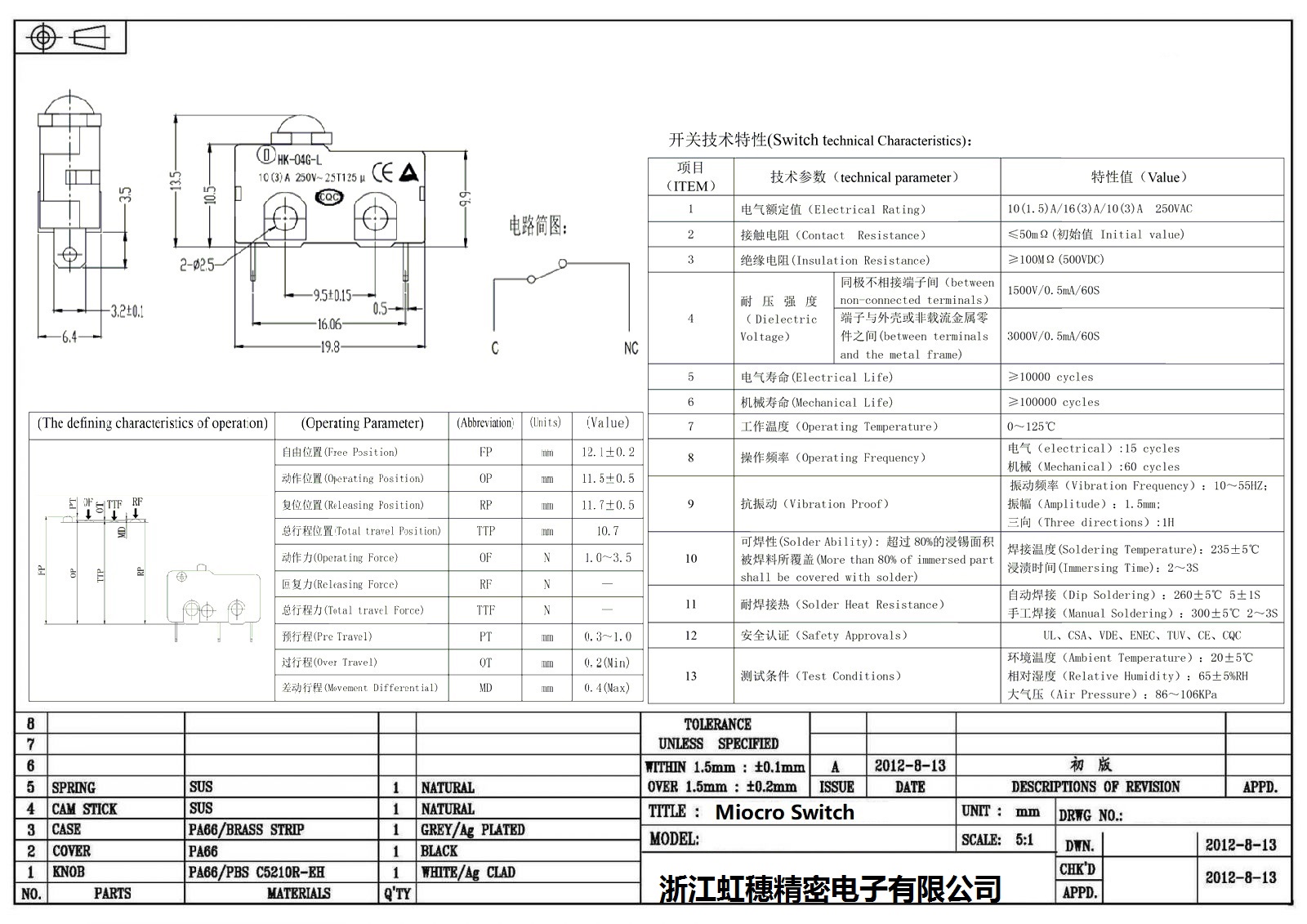.请根据额定值电流、操作负载、驱动杆的种类、使用温度等要求选择合适型号的开关;