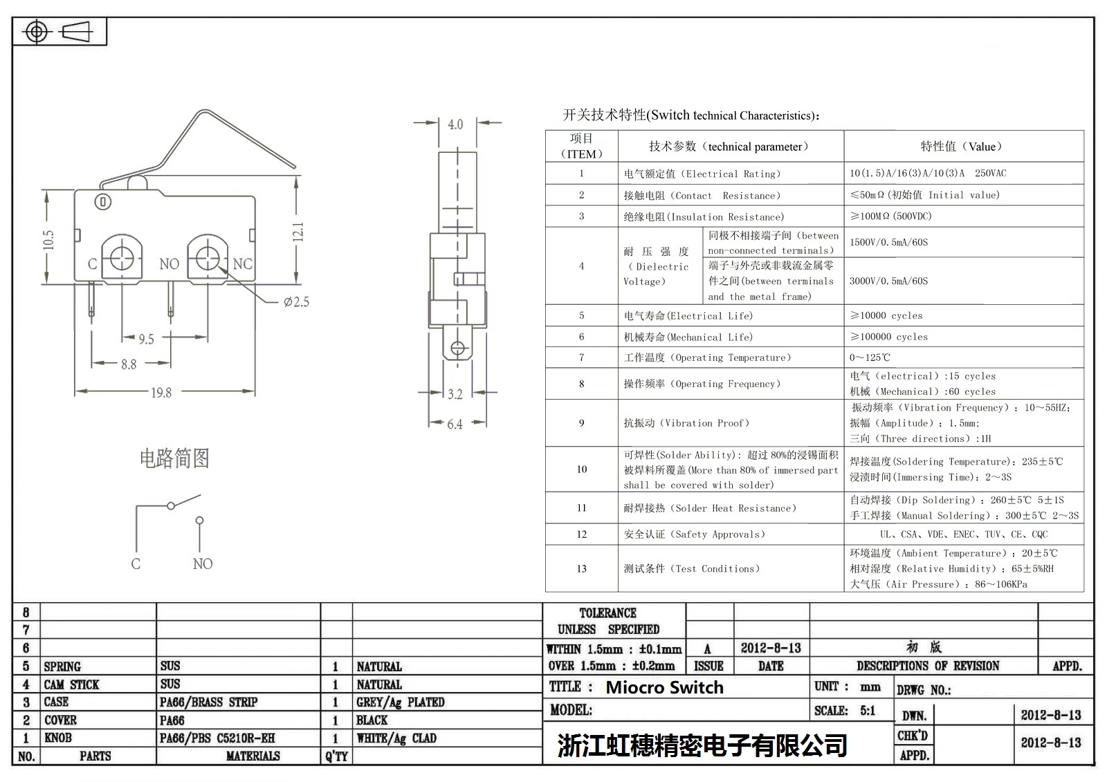 .请根据额定值电流、操作负载、驱动杆的种类、使用温度等要求选择合适型号的开关;