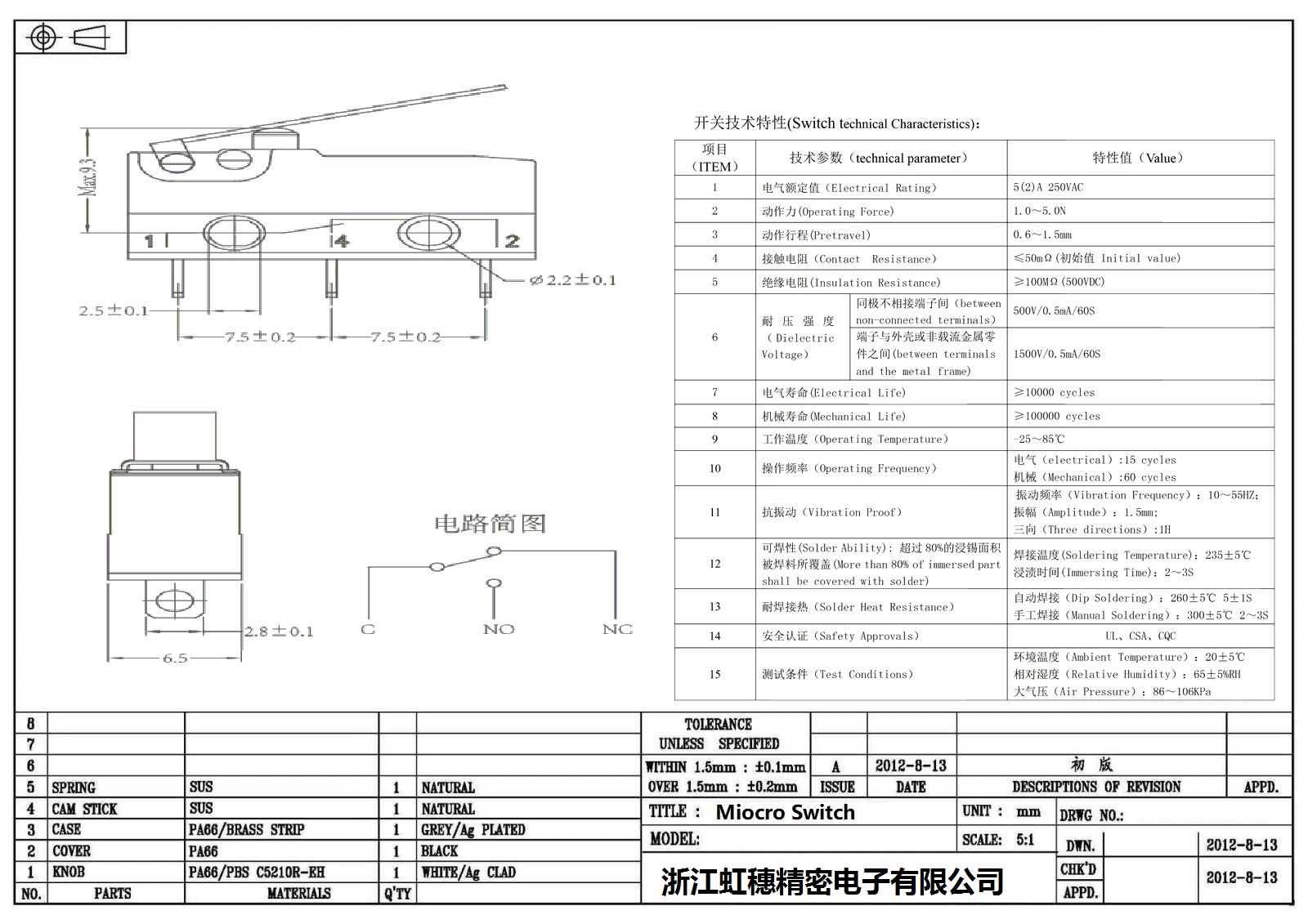 .请根据额定值电流、操作负载、驱动杆的种类、使用温度等要求选择合适型号的开关;