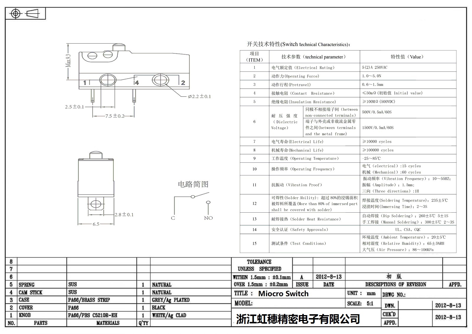 .请根据额定值电流、操作负载、驱动杆的种类、使用温度等要求选择合适型号的开关;