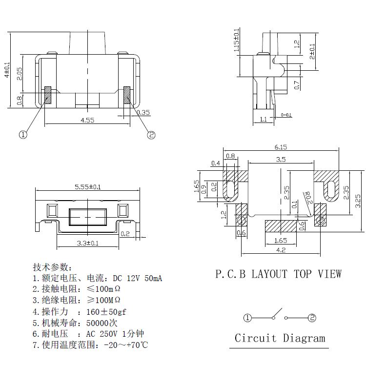 1. 额定电流、电压: DC 12V 50mA 2. 接触电阻: ≤100mΩMAX