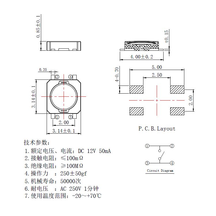 1. 额定电流、电压: DC 12V 50mA 2. 接触电阻: ≤100mΩMAX