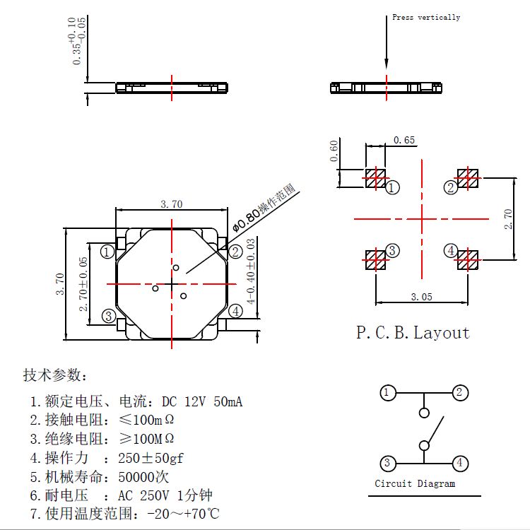 1. 额定电流、电压: DC 12V 50mA 2. 接触电阻: ≤100mΩMAX
