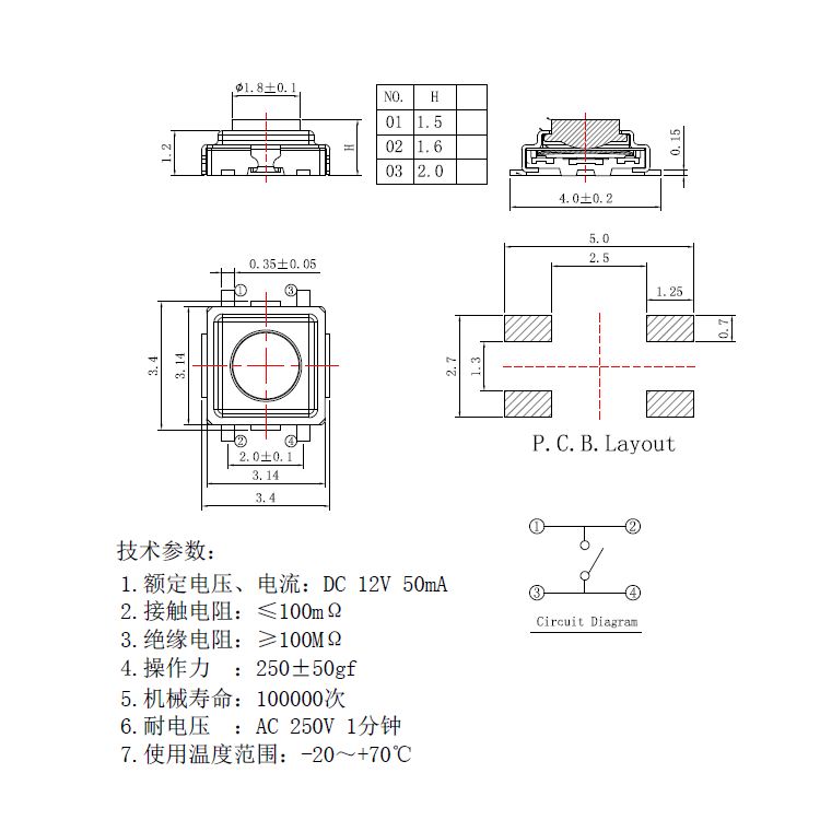 1. 额定电流、电压: DC 12V 50mA 2. 接触电阻: ≤100mΩMAX
