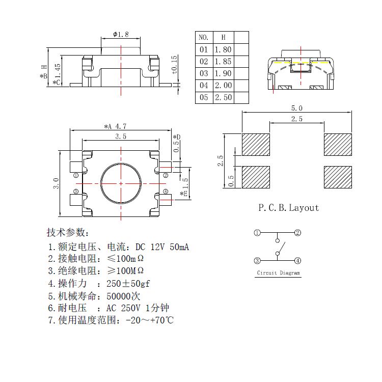 1. 额定电流、电压: DC 12V 50mA 2. 接触电阻: ≤100mΩMAX