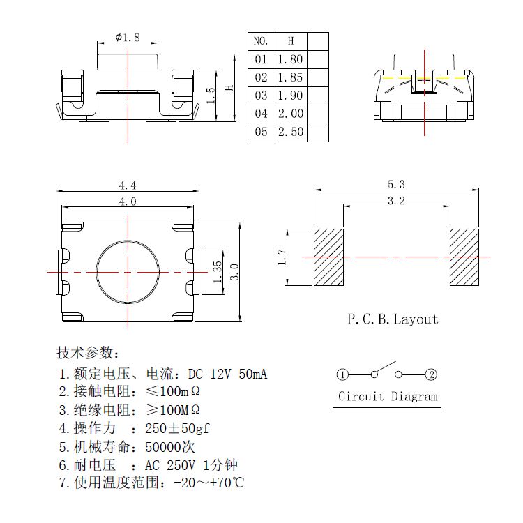 7. 使用湿度: ≤85% RH 8. 使用寿命: 50000次