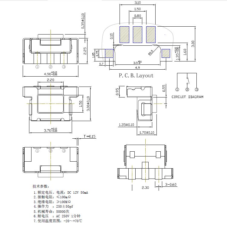 1. 额定电流、电压: DC 12V 50mA 2. 接触电阻: ≤100mΩMAX