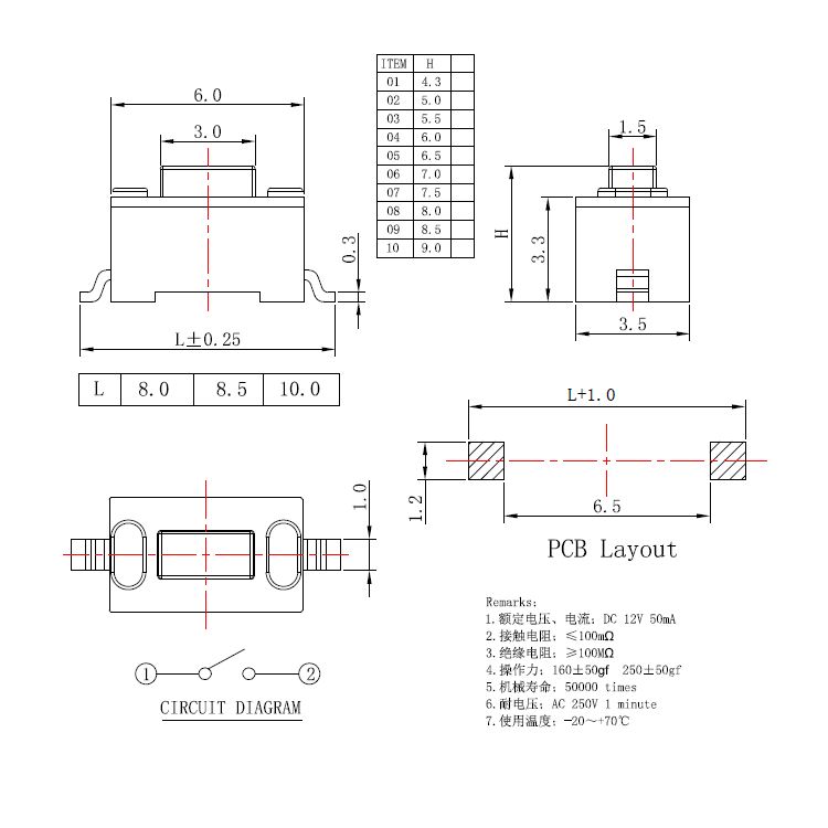 7. 使用湿度: ≤85% RH 8. 使用寿命: 100000次