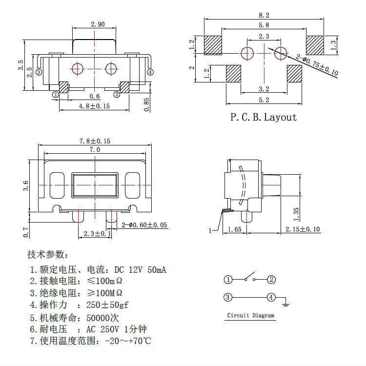 1. 额定电流、电压: DC 12V 50mA 2. 接触电阻: ≤100mΩMAX